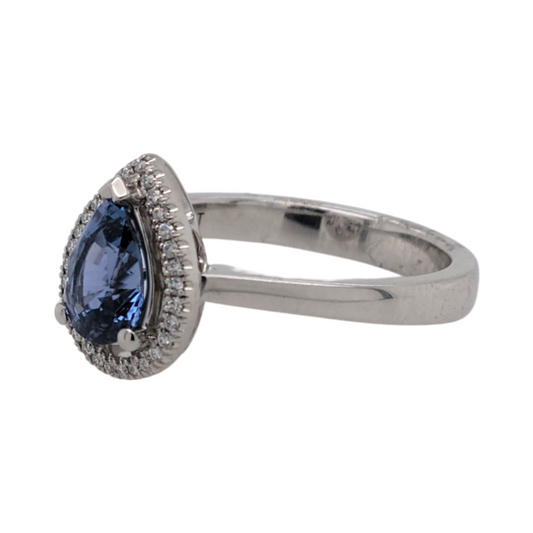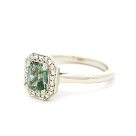 14k White Engagement Ring with 0.87ct Teal Sapphire and Accent Diamond Halo