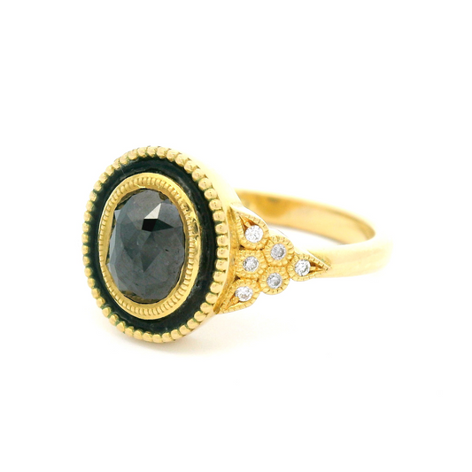 18k Yellow Enameled Ring with 1.42ct Black Rose-Cut Diamond and Accent Diamonds