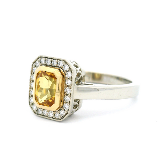 18k White and Yellow Halo Ring with 1.13ct Radiant-Cut Yellow Sapphire and Accent Diamonds