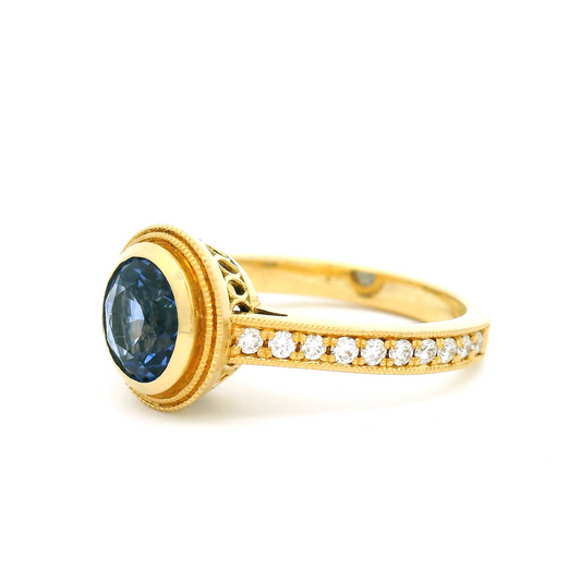 18k Yellow Vintage Style Ring with 1.89ct Round Blue Sapphire and Accent Diamonds
