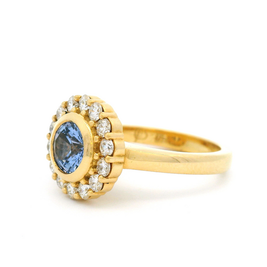 18k Yellow Bezel Set Halo Ring with 0.98ct Round Blue Sapphire and Accent Diamonds