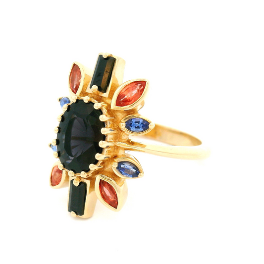Nox - 14k Yellow Ballerina Ring with 1.4ct Dark Purple Spinel, Accent Sapphires and Spinels