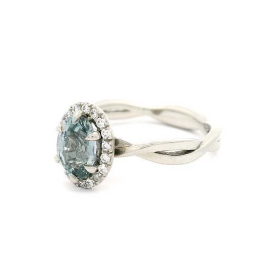 14k White Engagement Ring with 1.21ct Oval Grey-Blue Sapphire and Accent Diamond Halo