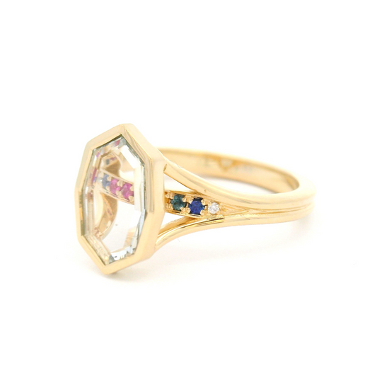14k Yellow Contour Band with 0.12ct Green Sapphire Baguette and Accent Coloured Diamonds