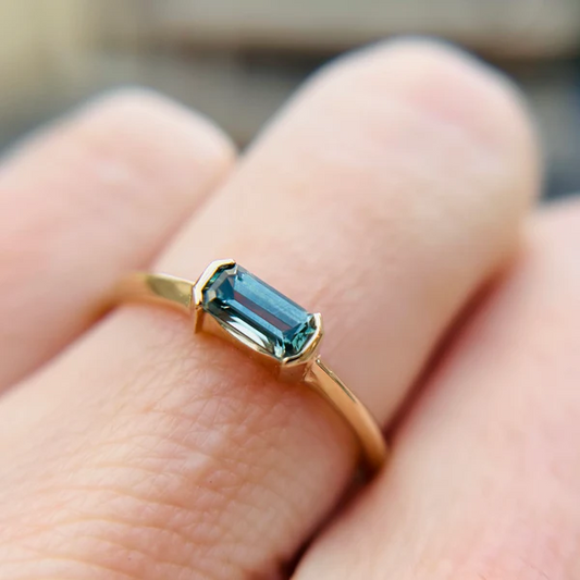14k Yellow Gold Channel-Set Solitaire with 2mm X 4mm Blue-Green Sapphire Baguette