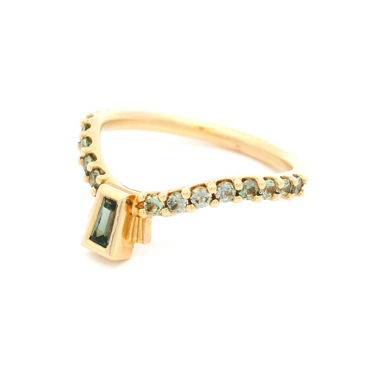 14k Yellow Contoured Band 0.50ct Teal Tapered Sapphire & Green Accent Sapphires