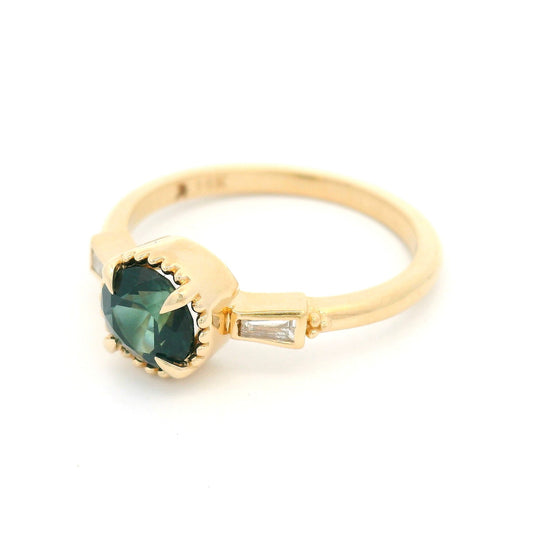 14k Yellow 3-Stone Ring with Natural 1.02ct Green Sapphire and Tapered Baguette Diamonds
