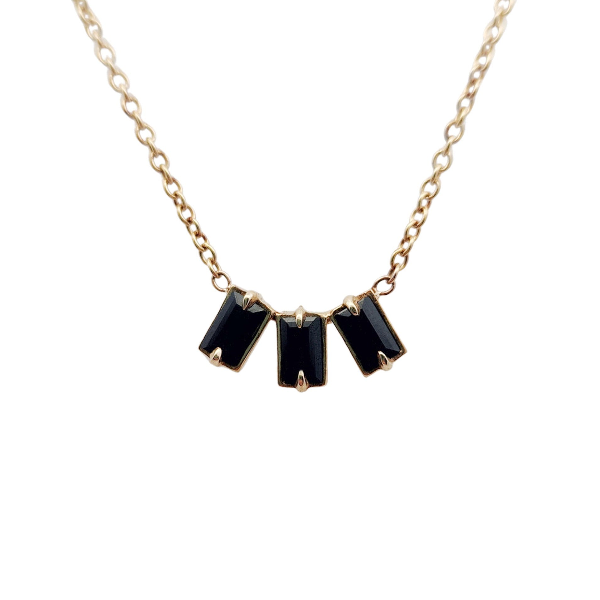 Made in 10k yellow gold with 3, baguette cut, black spinels weighing ~0.60total carat weight on a 1mm, 18" cable chain.