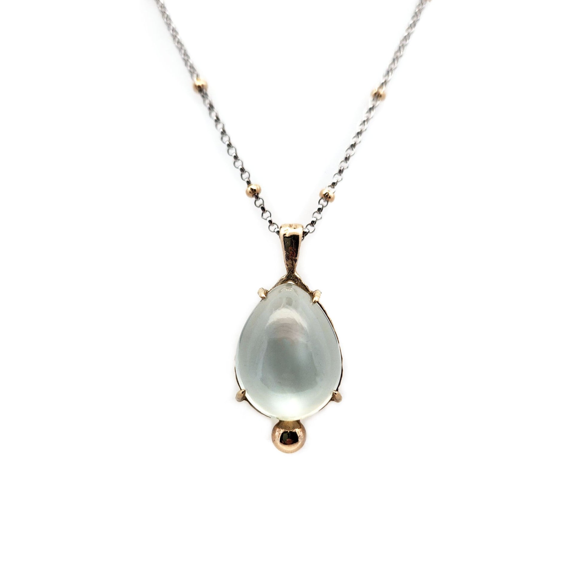 This elegant necklace features a smooth aquamarine teardrop shaped cabochon set in a mixed 10k + 14k yellow/white gold pendant. Its soft blue glow and refined design make it a timeless, wearable treasure.