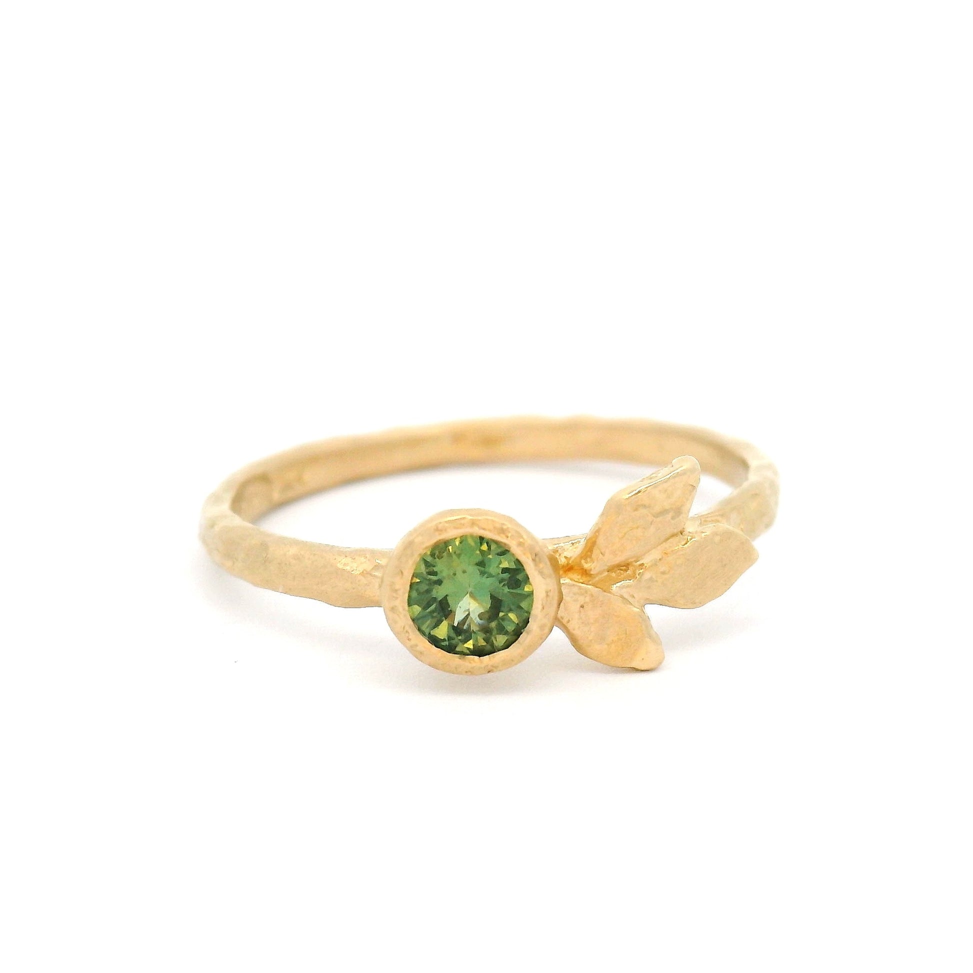 This 14K yellow gold bezel-set solitaire is inspired by nature’s flowing forms, with soft, sculptural lines that bring an organic elegance to the design. At its centre sits a 0.27ct round green sapphire, glowing with fresh colour. A delicate asymmetrical cluster of three carved leaves adds subtle texture and charm, enhancing the ring’s natural character.