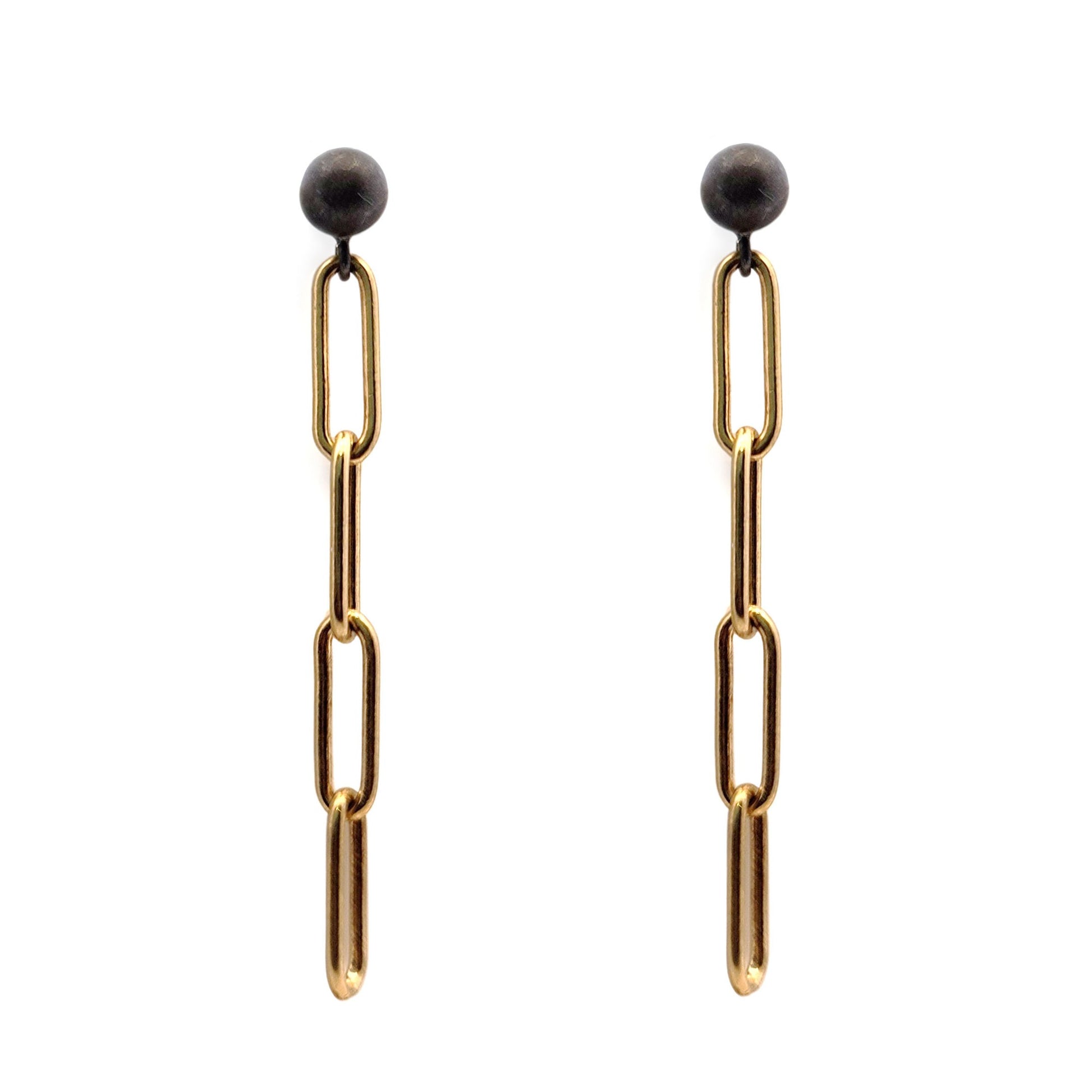 These striking earrings combine an oxidized silver ball stud with gold-filled chains for a bold, mixed-metal look. The contrast of darkened silver and warm gold adds depth and movement, creating an effortless blend of edgy and elegant. Lightweight, modern, and perfect for elevating any outfit.