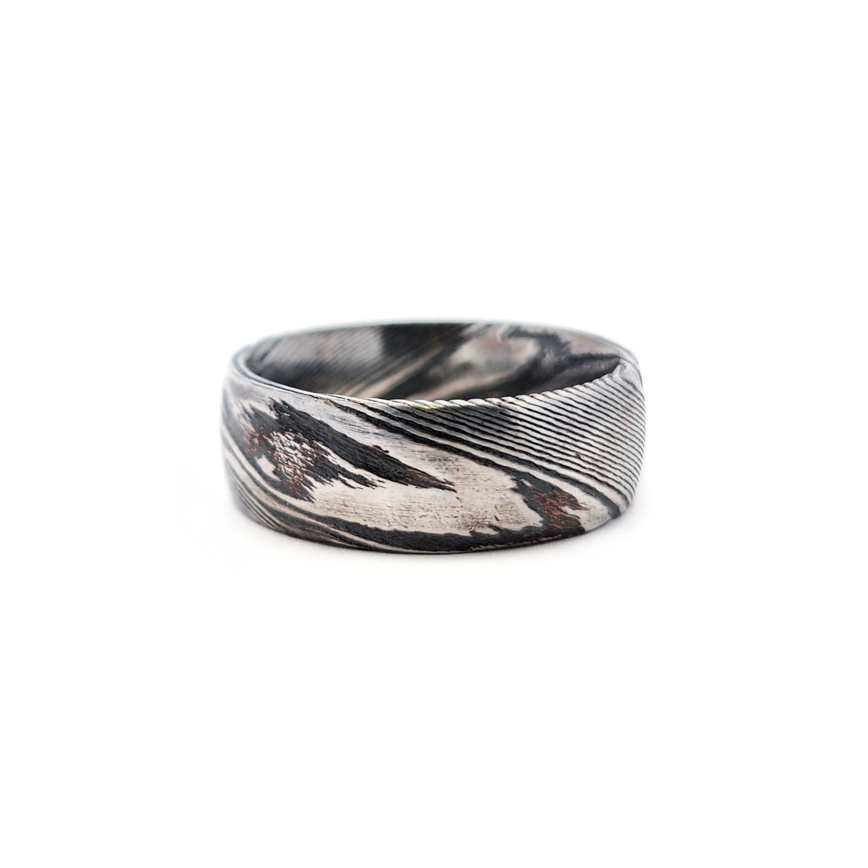 A bold, modern band showcasing the signature layered pattern of Damascus steel. Durable, lightweight, and uniquely patterned—no two rings are ever the same.