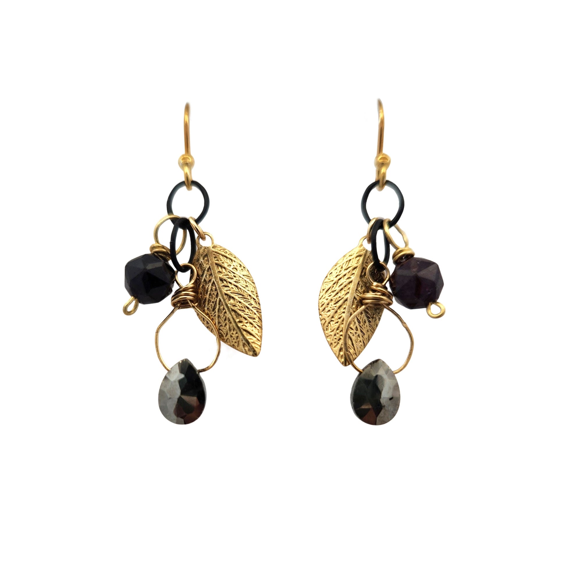 Delicate and nature-inspired, these earrings feature a charming cluster of gemstones paired with brass leaf elements. The combination of stones and warm metallic tones creates a whimsical, elegant look. Finished with vermeil ear hooks, they offer both luxury and comfort for everyday wear or special occasions.