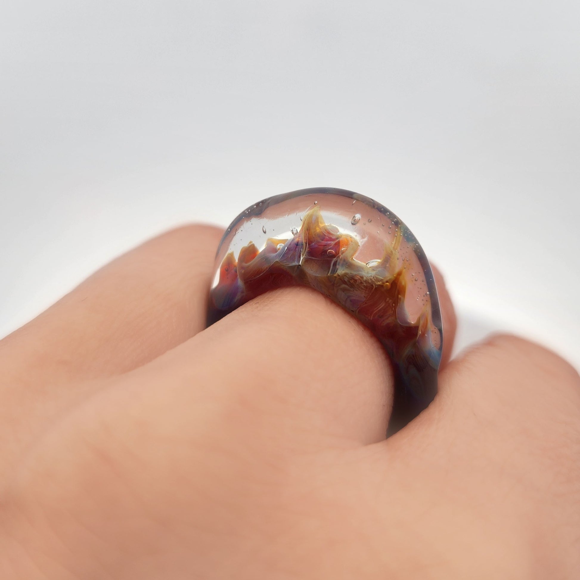 This enchanting ring is handcrafted in glass. With cloud-like patterns, evoking a sense of mystique and movement. It’s a whimsical, statement-making piece that adds a dreamy, ethereal touch to any outfit.