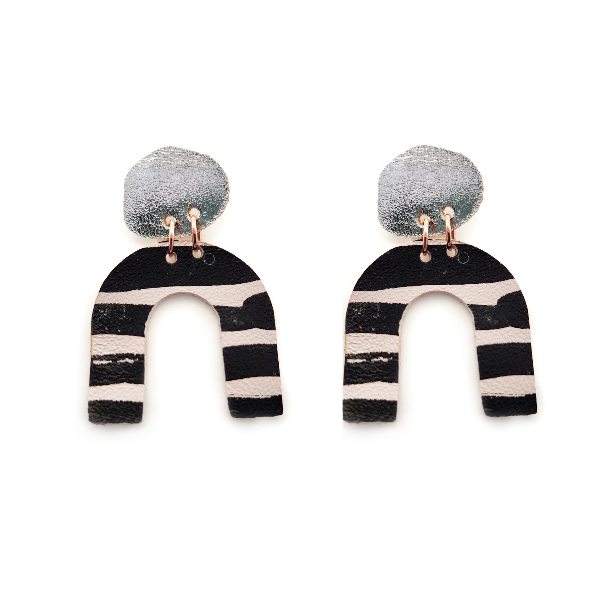 These earrings are crafted from leather, hand-cut and hand-dyed for rich color and character. Each pair features a unique printed design, giving every piece its own subtle variation and artisanal charm.