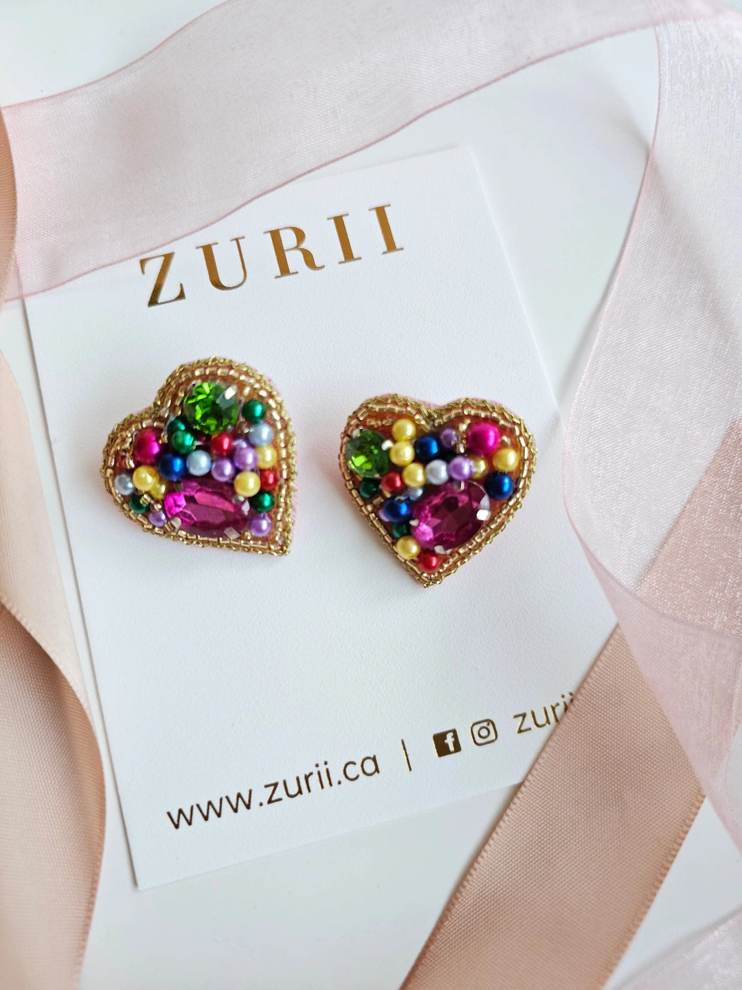 Capture romance and sparkle with these hand-embroidered heart stud earrings from Zurii, adorned with shimmering beads, lustrous pearls, and colorful stones for a luxurious, boho vibe.
