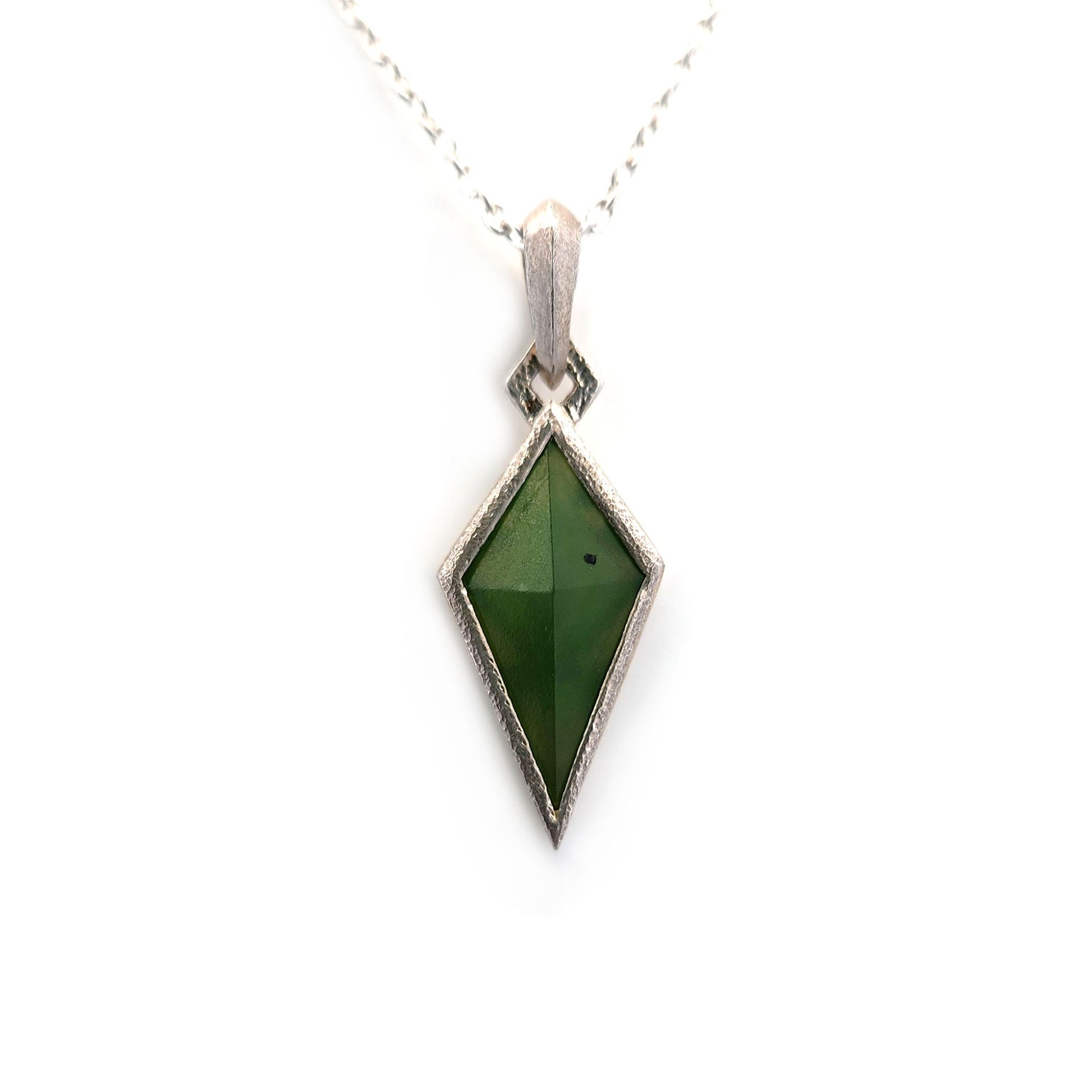 This striking pendant features a kite-shaped nephrite jade set in sterling silver, combining clean geometric lines with the stone’s smooth, deep green tones. A modern and elegant piece, perfect for layering or wearing solo as a statement accessory.