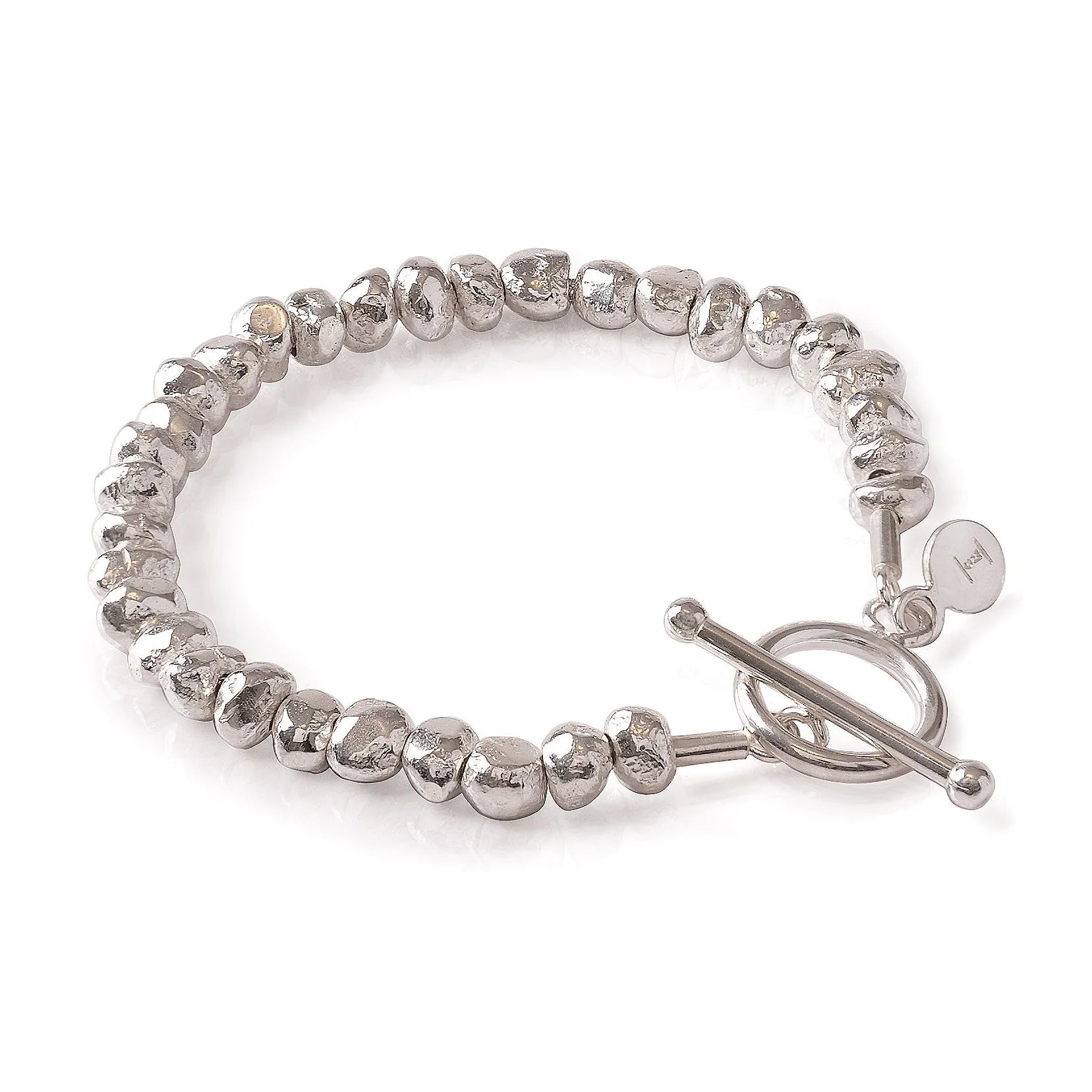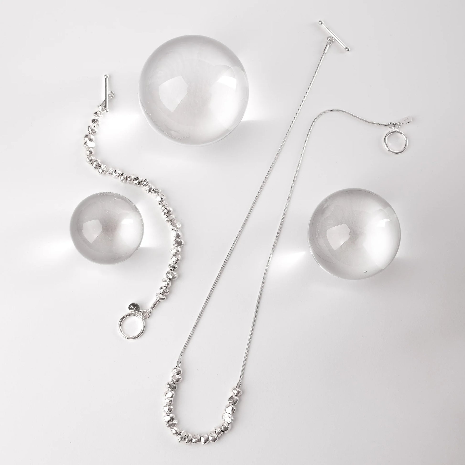 Crafted from recycled silver and copper, each piece begins with precisely measured metals melted into distinctive beads, each with its own texture and shape. Hand-drilled, faceted, and polished, the beads are formed into contemporary jewellery, reflecting the artist’s signature craftsmanship.