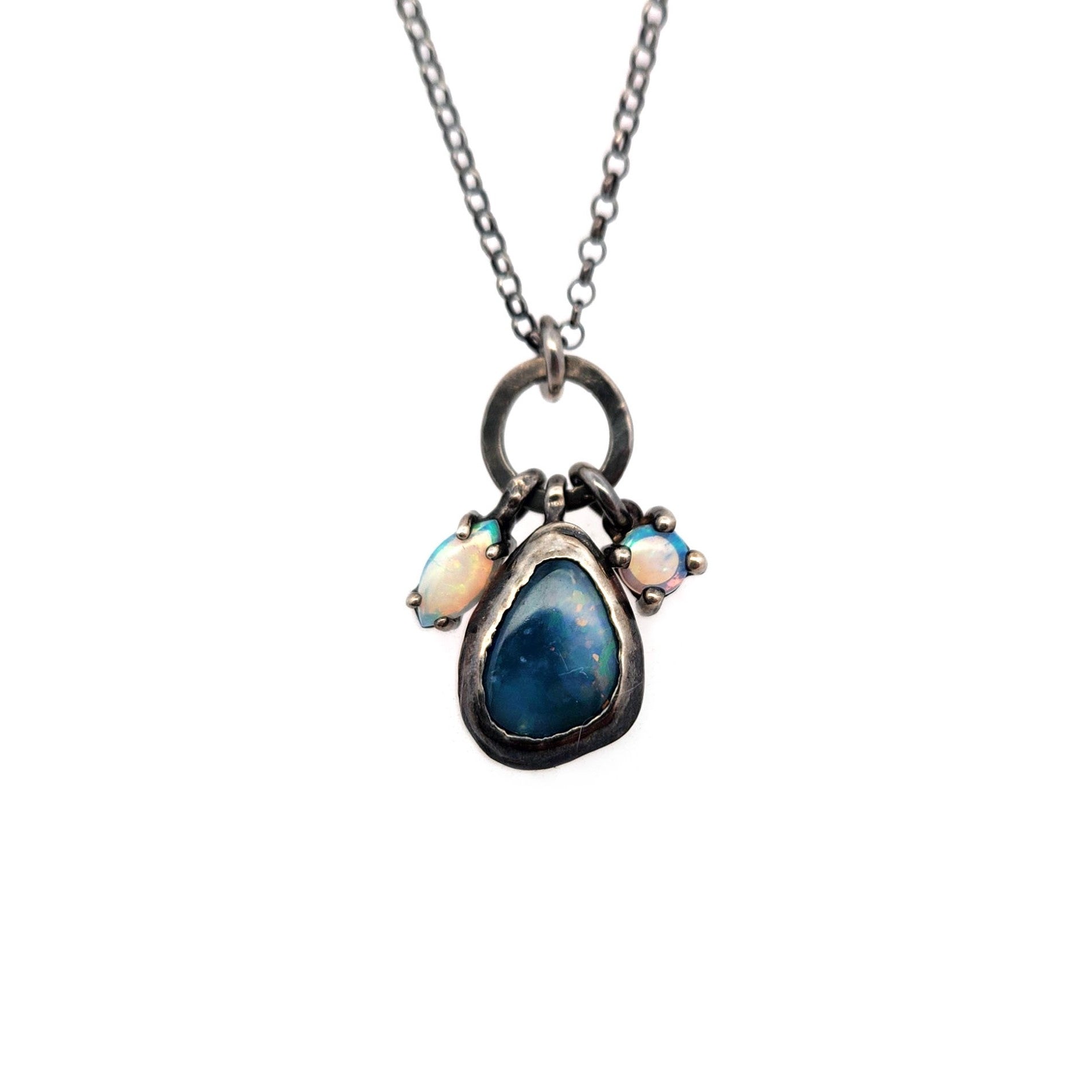 This handcrafted pendant features three opal stones elegantly suspended from oxidized sterling silver, creating a subtle interplay of color and light. The oxidized finish enhances the opals’ iridescence, making it a unique, eye-catching piece.
