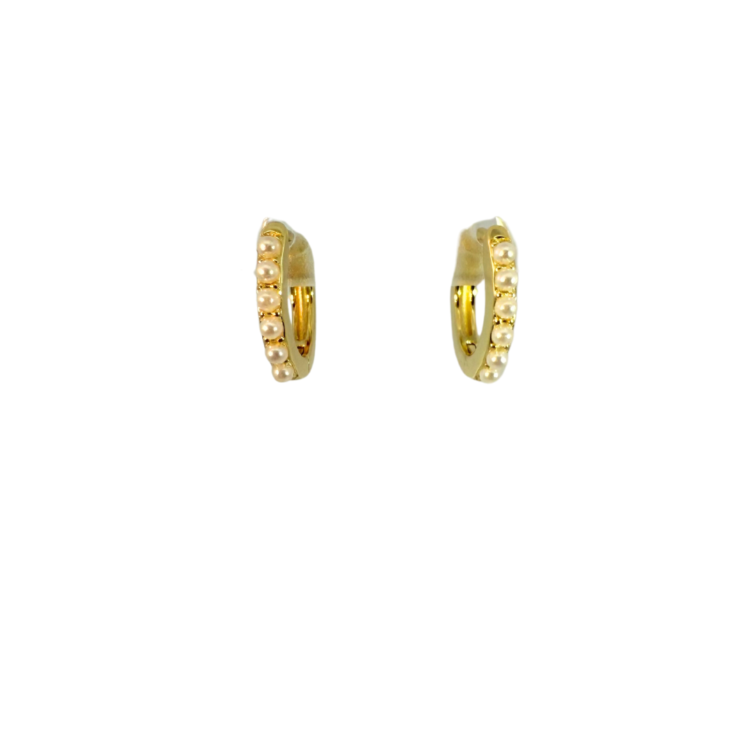 These delicate huggie hoops are plated in warm yellow gold and accented with petite pearls for a fresh, timeless look. Lightweight and versatile, they’re perfect for everyday wear—bringing just the right touch of elegance to any outfit.