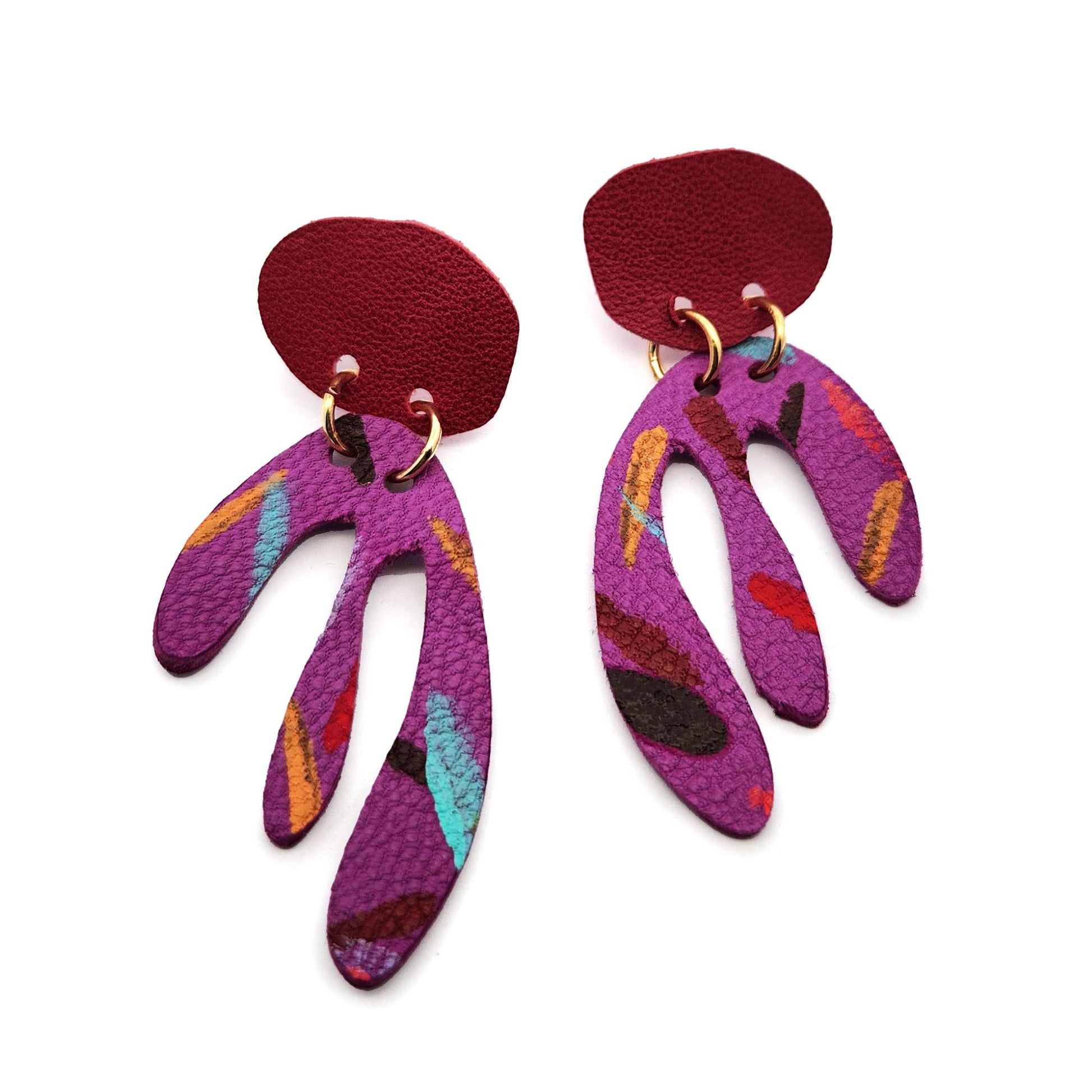 These earrings are crafted from leather, hand-cut and hand-dyed for rich color and character. Each pair features a unique printed design, giving every piece its own subtle variation and artisanal charm.