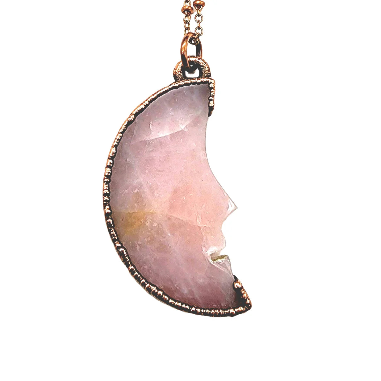 One copper electroformed Rose Quartz Man in the Moon complete on a 20" soldered copper chain.