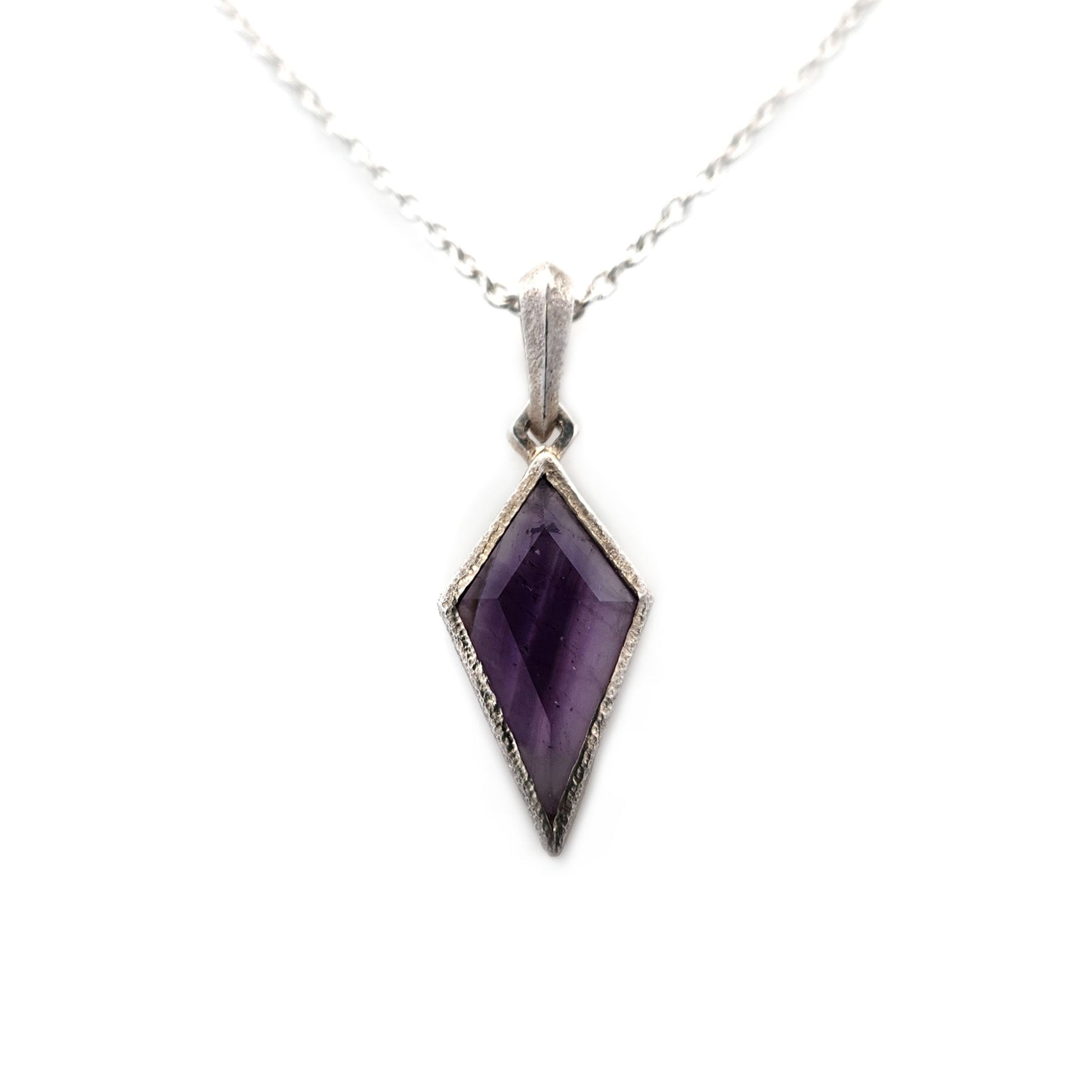 This striking pendant showcases a kite-shaped amethyst set in sterling silver, combining geometric precision with natural elegance. Perfect for adding a modern, sophisticated touch to any outfit.