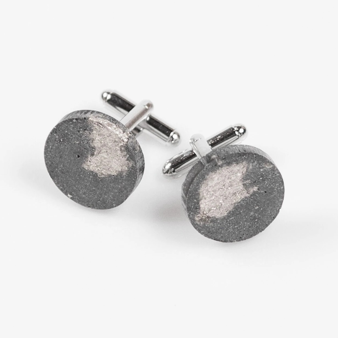 Crafted from lightweight concrete with an embedded silver leaf detail, these circular cufflinks offer a clean, understated finish with a distinct material edge.