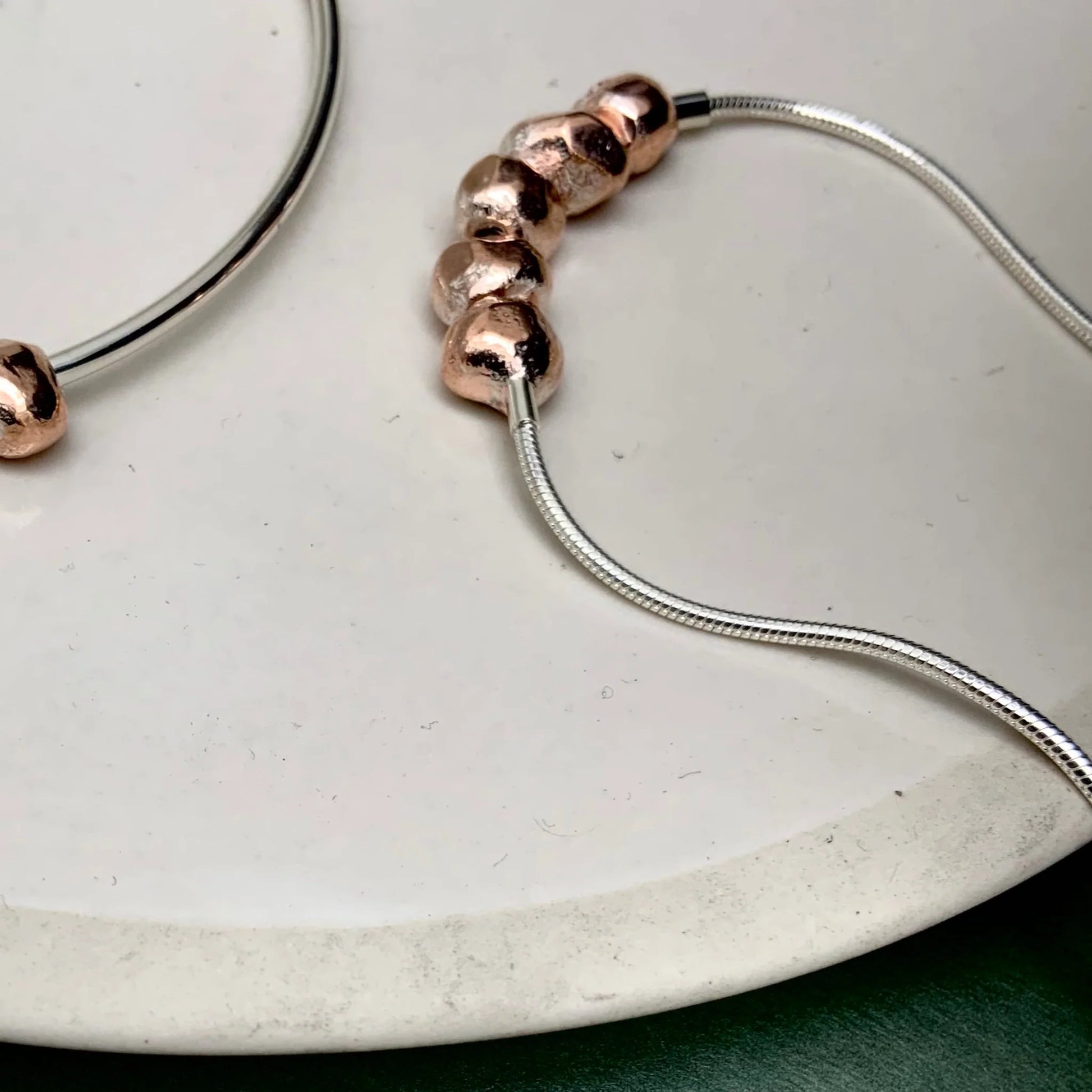 Handmade from recycled silver and copper, this bracelet showcases five distinctive copper beads, each melted, shaped, and polished by hand.