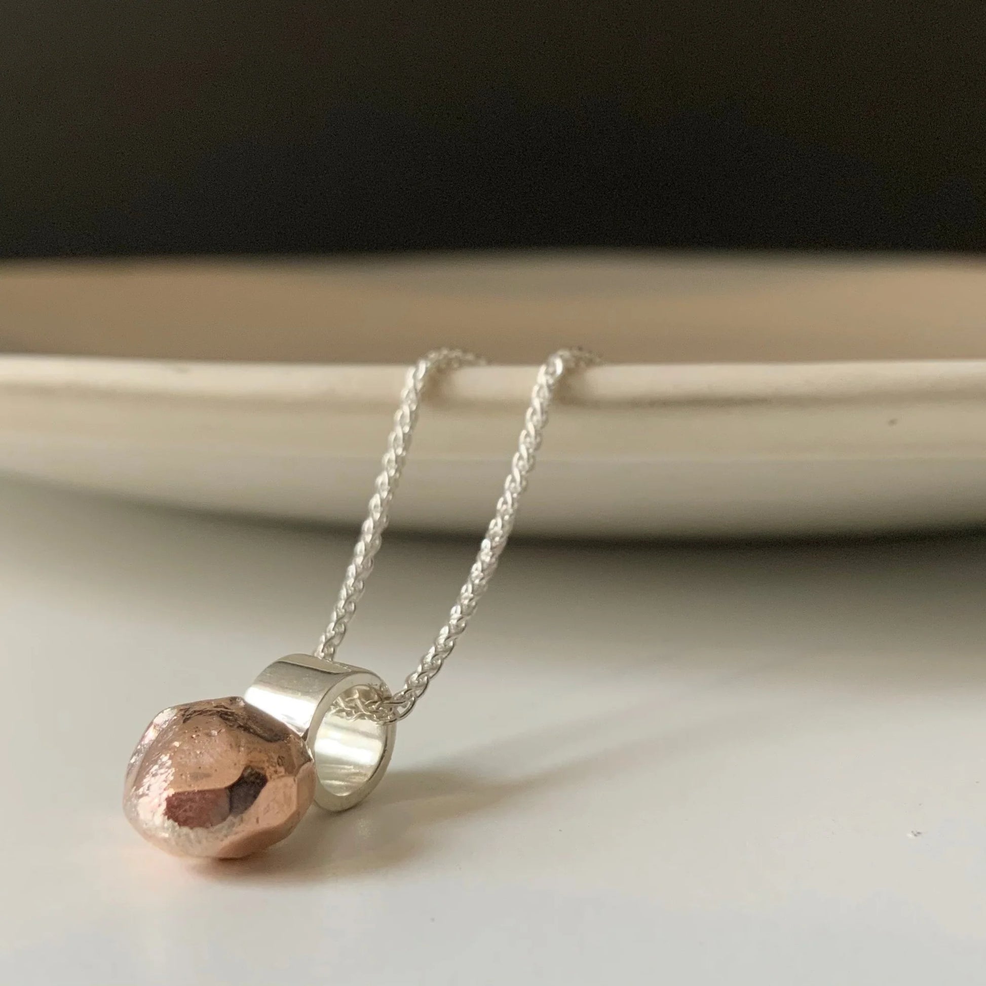 Made from recycled silver and copper, each piece starts with carefully measured metals melted into unique, textured beads. Every bead is hand-drilled, faceted, and polished before being assembled into modern jewellery, showcasing the artist’s signature design.