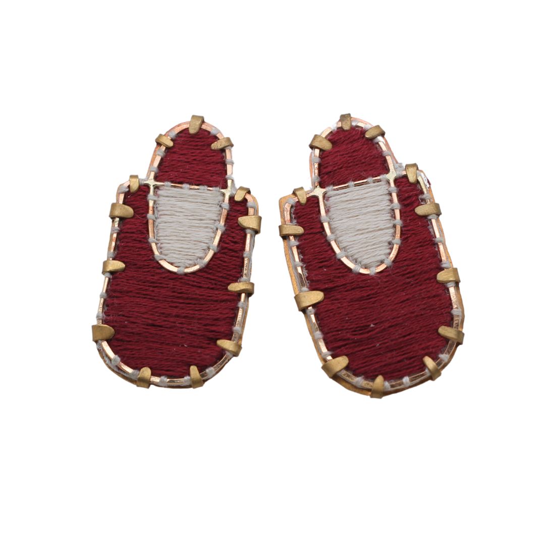 Hand-embroidered red and white thread arch earrings with bronze framing and gold-filled posts.