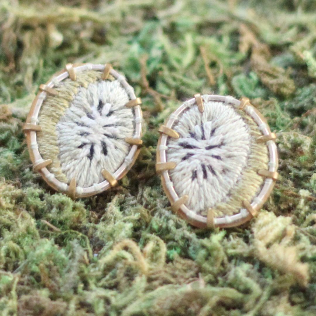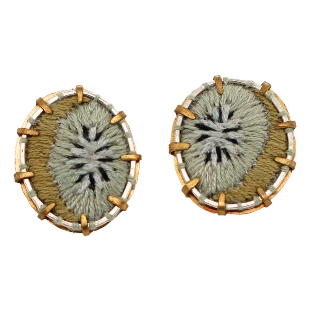 Hand-embroidered small kiwi stud earrings with bronze framing and sterling silver posts.