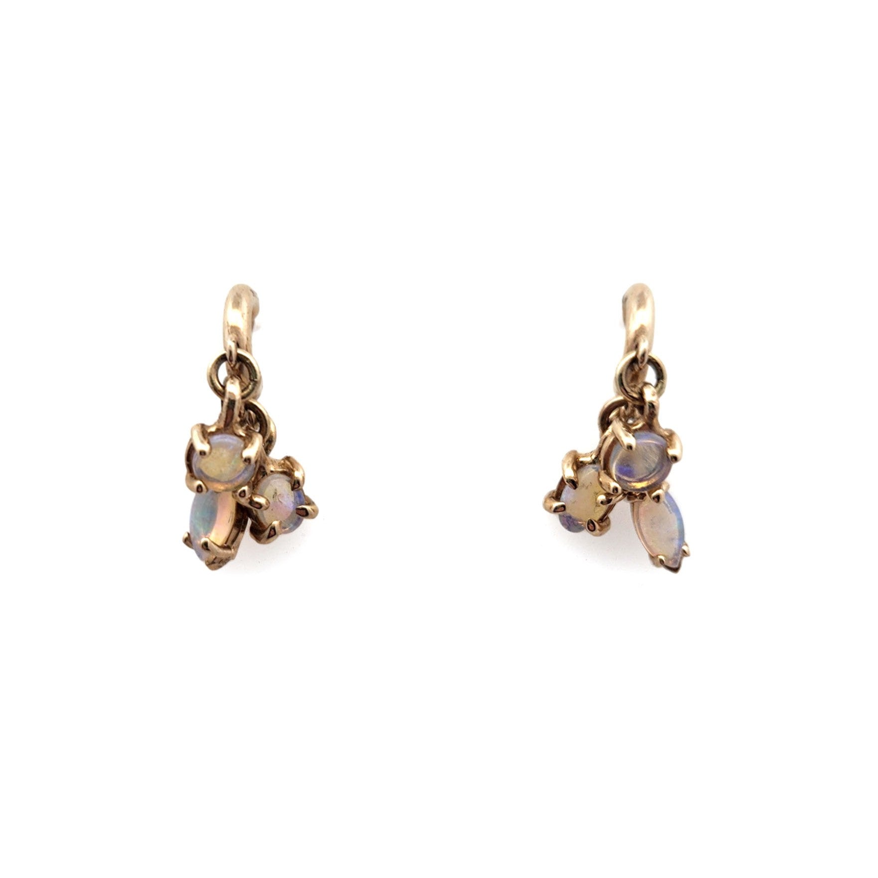 Delicate and luminous, these 10k yellow gold earrings feature a trio of clustered opals that shimmer with soft, iridescent color. Their simple yet elegant design makes them perfect for everyday wear or adding a subtle glow to any look.
