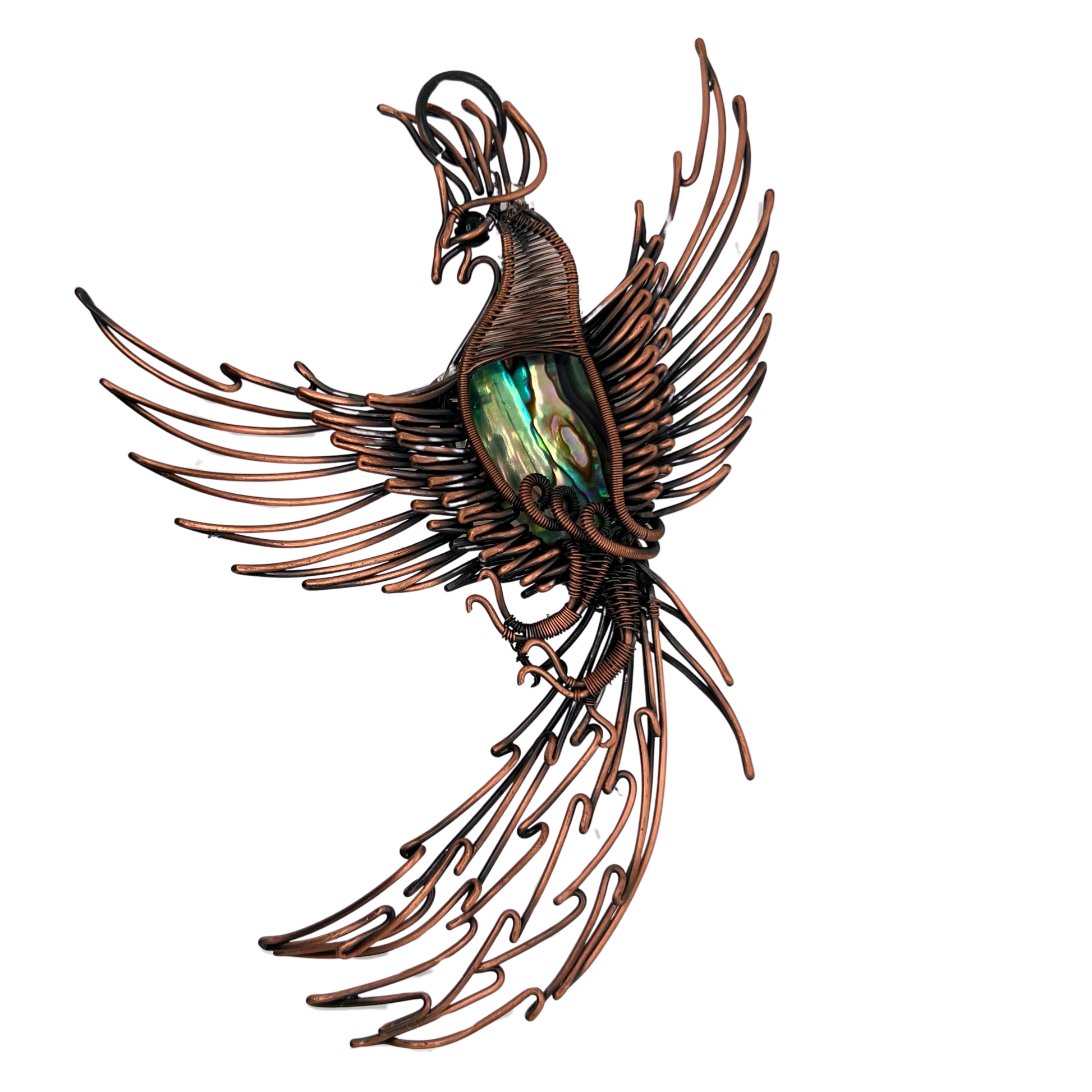 Copper wire-wrapped pendant in the shape of a flying phoenix.