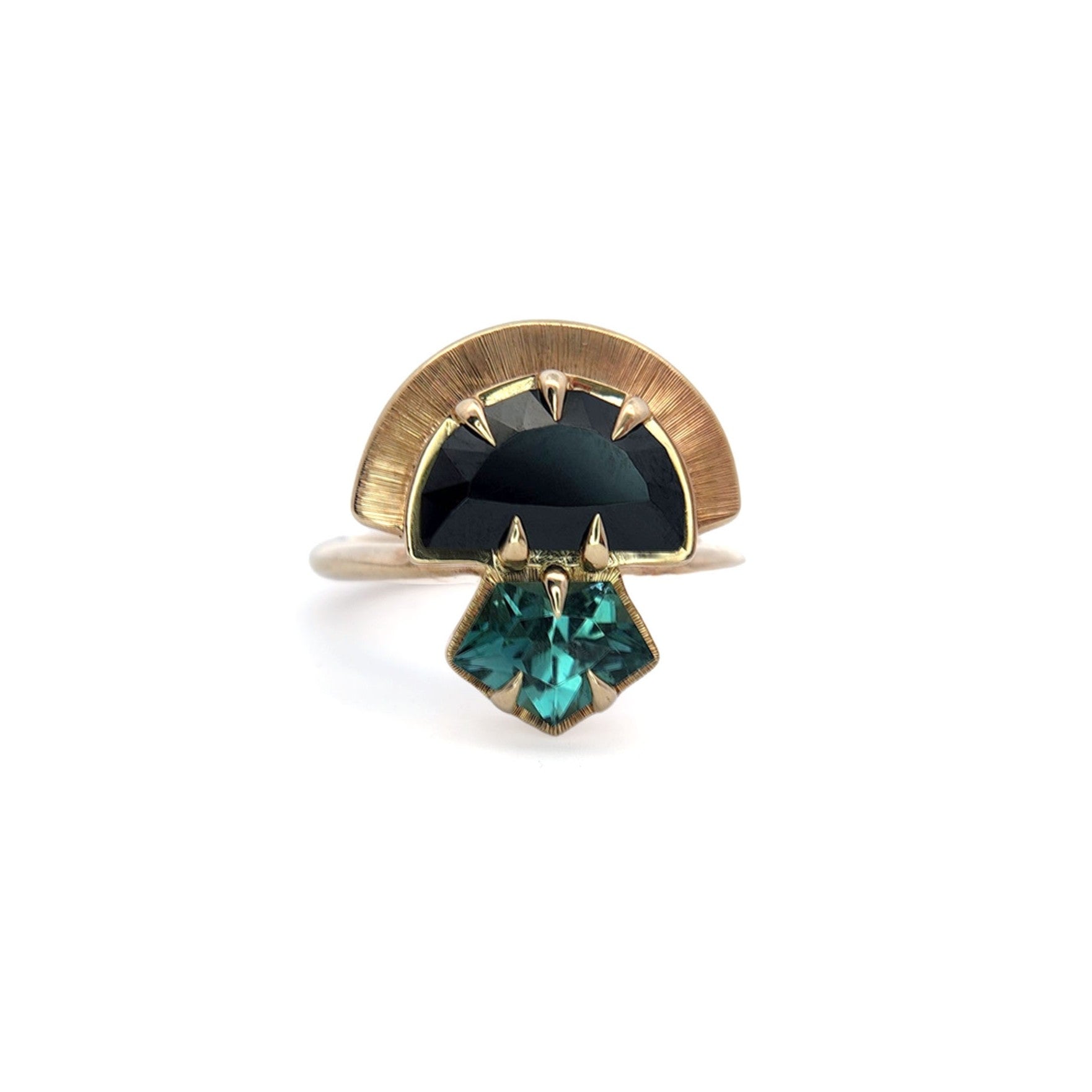 Inspired by ancient South American civilizations, this bold ring features a 2.52ct black half-moon spinel and a 0.99ct pentagonal mint tourmaline. They are claw set into 10k yellow gold with engraved accents around the settings.