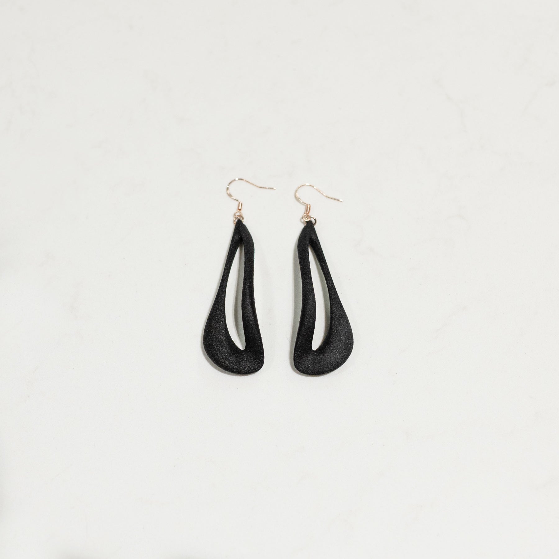 Eloura earrings are produced through SLS 3D printing in nylon PA12, an innovative and sustainable material known for precision, strength, and lightness. The process minimizes waste while allowing the organic, gravity-pulled geometry to take shape. Finished in matte black, Eloura balances statement-making scale with wearability, making it an ideal piece for evening presence. The earring hardware is crafted in brass rose gold tone plated 925 silver, adding both durability and a refined touch of luxury.