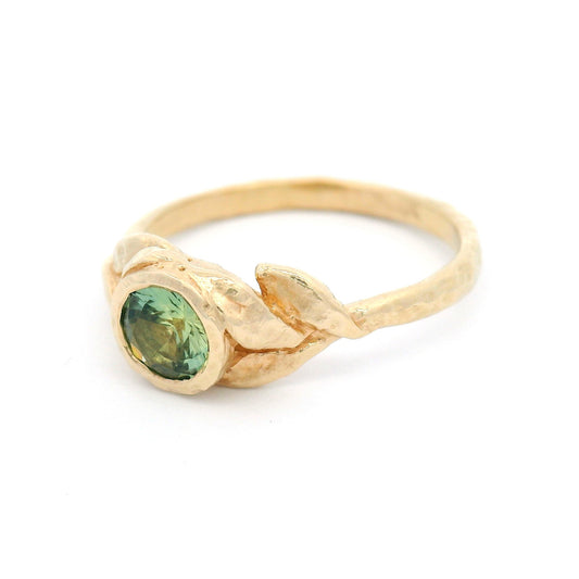 14k Yellow Organic Leaf Carved Bezel-Set Solitaire with 2.01ct Green-Blue Sapphire
